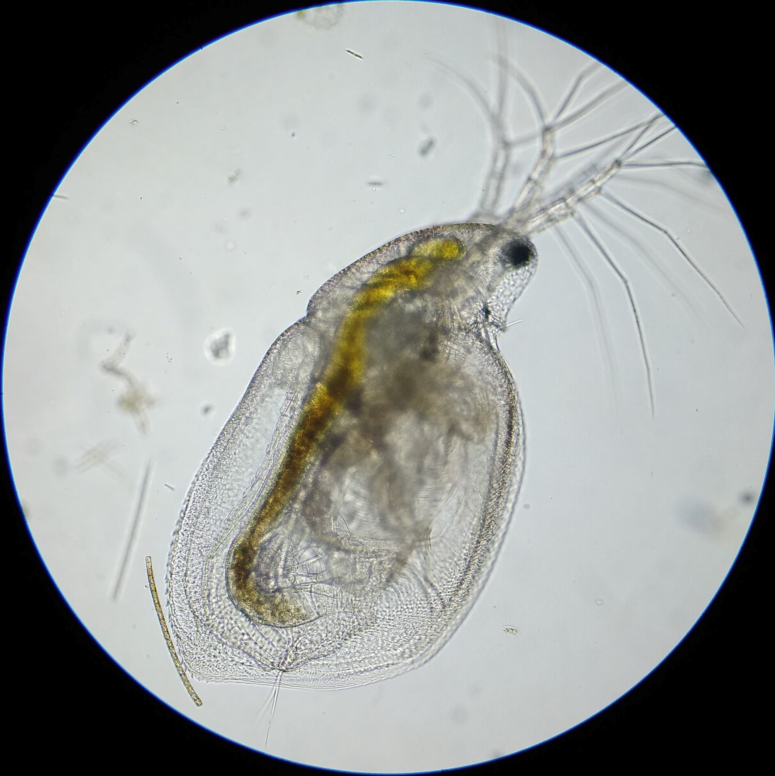 Des petites flaques temporaires aux lacs, la daphnie se retrouve partout! C’est un petit crustacé mesurant d’un à quatre mm est assez discret mais facilement discernable dans l’eau. Nageant à la verticale grâce à ses deux grandes antennes ciliées elle se déplace souvent en groupe de plusieurs dizaines d’individus.